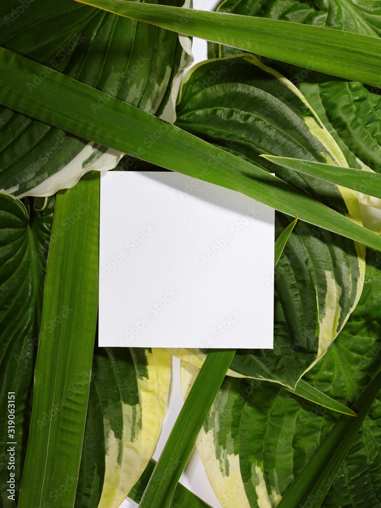 Beautiful Layout Made of Tropical Green Leaves and Empty White Paper Card For Copy Space. Minimal Natural Background