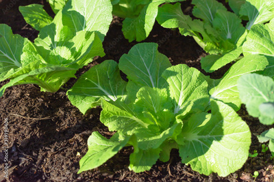 Young and healthy organic Chinese cabbage cold crop growing at home garden