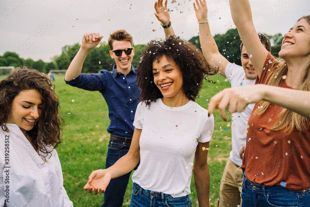 Group of friends at the park dancing under a rain of confetti - Millennials have fun in a public garden in summer at sunset
