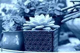 Various Succulent Plants Pots At Homemade Stand In A Garden At Sunny Day.