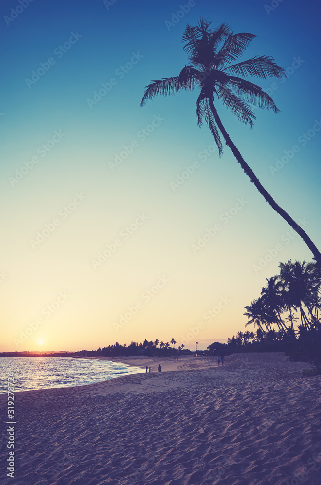 Color toned picture of a tropical beach with coconut palm tree silhouette at sunset.