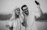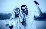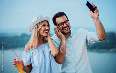 Happy couple listening to music with smartphone and headphones. Love and tenderness, dating, romance. Lifestyle concept