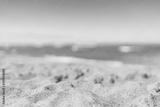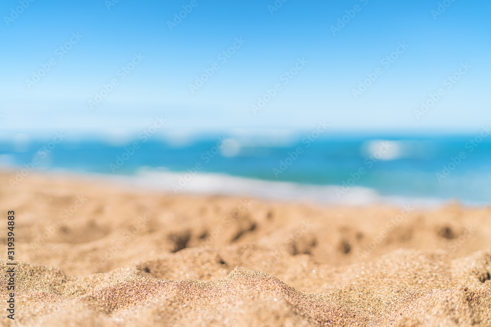 Summer beach background blurry blue ocean on white sand texture. Tropical Caribbean travel vacation copy space for advert.