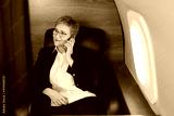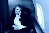 beautiful aged woman in the cabin of a private plane in an armchair with a phone in her hands