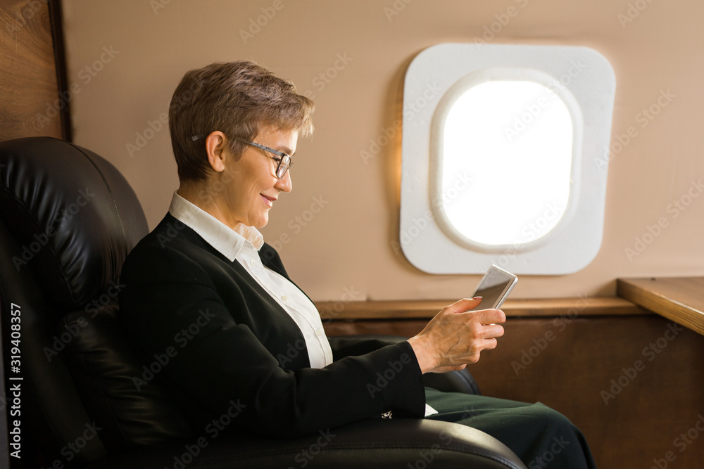 beautiful aged woman in the cabin of a private plane in a chair with a tablet in her hands