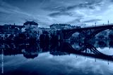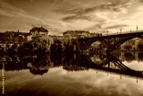 Amazing view of Maribor Old city, Main bridge (Stari most) on the Drava river before sunrise, Slovenia. Scenic cityscape with color sky and reflection, travel background for wallpaper or guide book