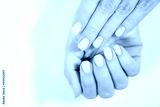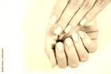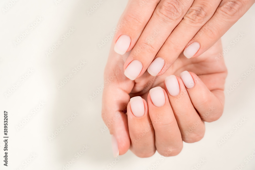 Closeup top view of 2 beautiful hands of woman with professional manicure, nails painted with light pink color and covered with mat top without glossy shine. Nude style design of fingernails.