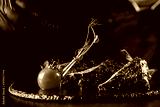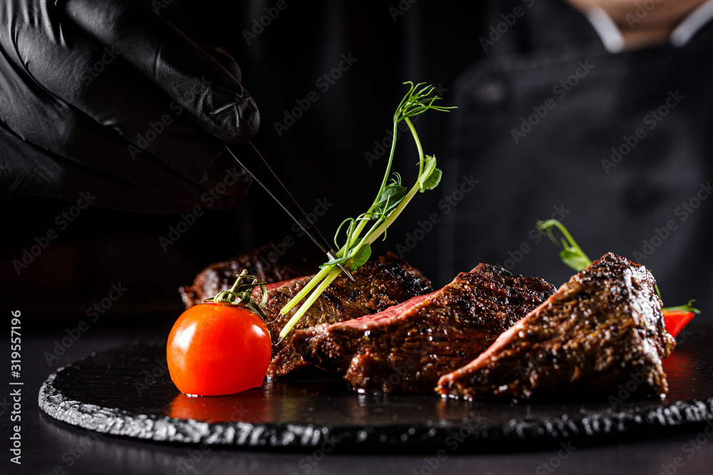 The concept of cooking meat. The chef cook decorates a meat dish on a black background, a place under the logo for the restaurant menu. food background image, copy space text