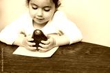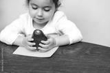 Little cute smiling black hair girl holding green avocado. Healthy food for children concept. Selective focus on avokado.