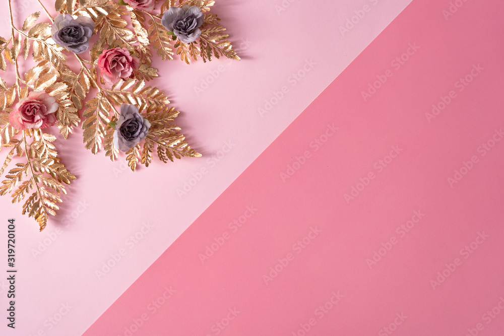 Creative layout made with pastel pink and purple flowers and gold leaves. Flat lay. Nature concept. Floral Greeting card. Colorful spring flower background. Nature Trendy Decorative Design.