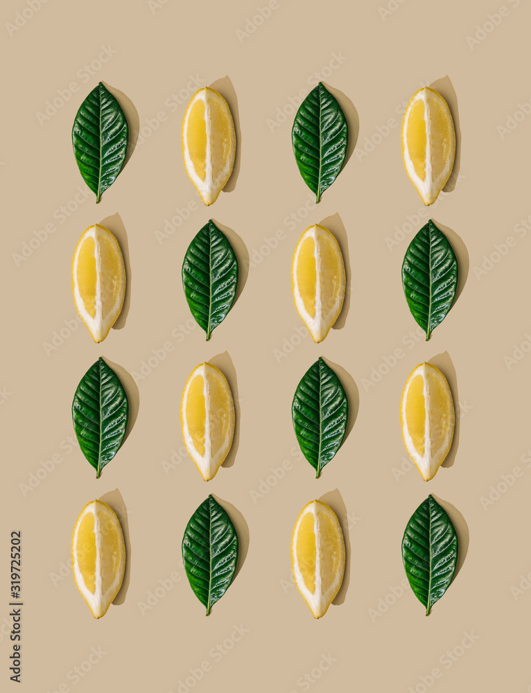 Minimal nature pattern with green leaves and lemon slices on pastel sand background. Summer fruit concept. Flat lay social mockup.