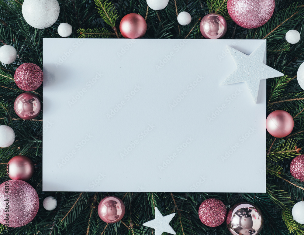 Natural composition with Christmas tree branches and pink decoration. Creative copy space layout. Flat lay background. Holiday concept.