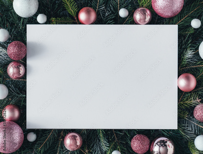 Natural composition with Christmas tree branches and pink decoration. Creative copy space layout. Flat lay background. Holiday concept.