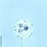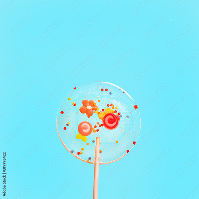 stylish transparent sweet Lollipop. clear candy with sprinkles on blue background. modern sweets. minimal creative concept. close up