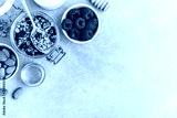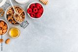 Healthy breakfast Granola with fresh raspberry, almond and honey on gray stone background