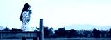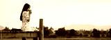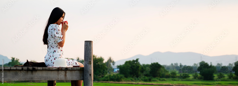 Young woman sits sipping coffee on balcony, looking at nature farmland, panoramic scenery, banner design