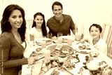 Parents Children Family Eating Pizza & Salad At Dining Table