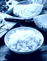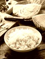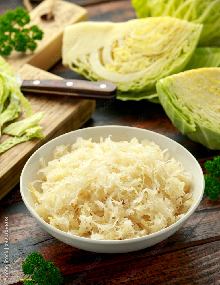 Fresh pickled cabbage in white bowl on wooden table. healthy food