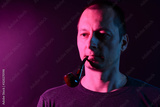 A man smoking tradition pipe. Vibrant colors with neon pink light