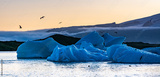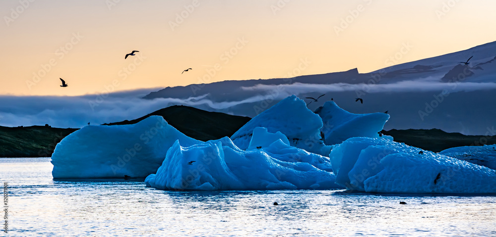 Amazing sunset over the famous glacier lagoon Jokulsarlon, view of icebergs floating. Location: Jokulsarlon glacier lagoon, Iceland. Artistic picture. Beauty world. Travel concept