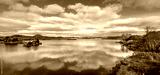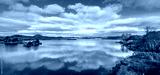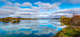 Amazing sunny day on lake Myvatn, Iceland, Europe. Beautiful clouds reflected in the blue water of a volcanic lake. Artistic picture. Beauty world. Travel concept. Panorama
