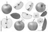 Green Apple for design package. Set of whole Apple, half and slice with leaf and flowers isolated on white background