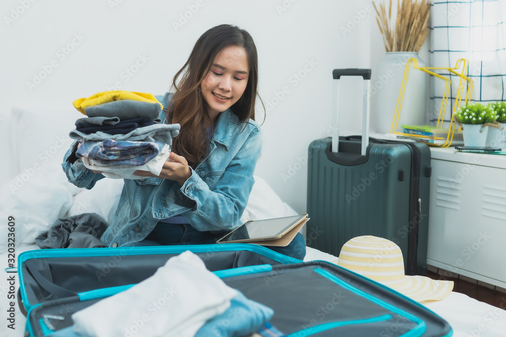 Preparation and trip planning on holiday concept, Thai and Asia happy woman packing clothes in to luggage suitcase bag to travel on bed