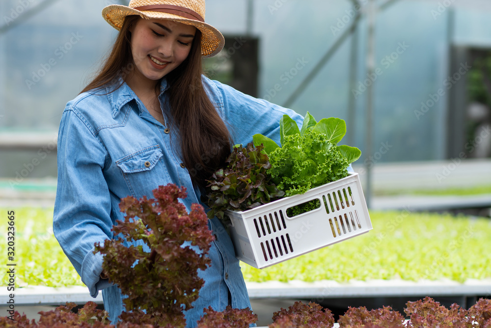 Healthy food organic vegetable farm, Happily attractive woman owner crate full of hydroponic vegetables, hold and combine plants in basket in the greenhouse
