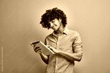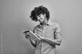 Smiling arabian young man looking at his digital tablet screen