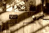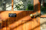 Polite sign seen attached to an interior, glass house wooden door informing people to close the door on existing. The glass house is used to maintain tropical plants all year long