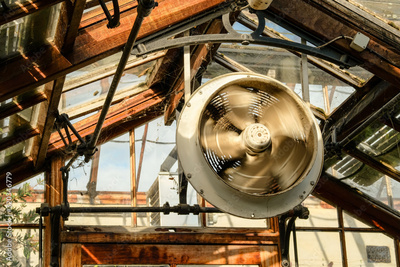 Large, industrial type cooling fan seen spinning inside a large green house. Used to keep tropical plants circulated with warm air. The fan has a large amount of dust collected in it.