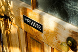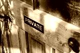Private sign seen attached to an old, wooden door located in a large glass house. The rustic wooden texture of the wood and ornate brass door knob is seen with the sun casting shadows.