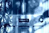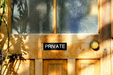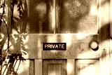 Private sign seen attached to an old, wooden door located in a large glass house. The rustic wooden texture of the wood and ornate brass door knob is seen with the sun casting shadows.