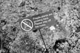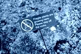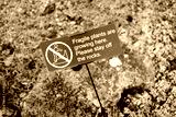 Improvised sign warning people to keep off a delicate garden rockery whereby alpine plants are growing.