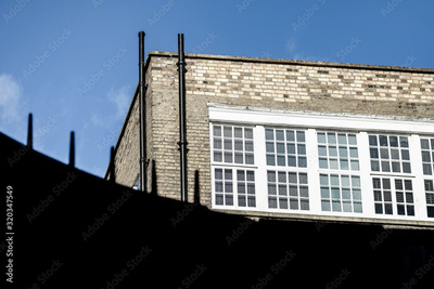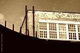 Abstract view of a disused factory showing the lattice style windows. A nearby, out of focus factory gate is seen together with spikes on the top of the gate.