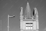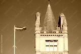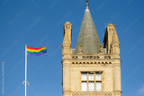 LGBT flag seen flying above a famous college located on the Cambridge university campus. Part of the historic, old tower is seen on a clear blue sky background.
