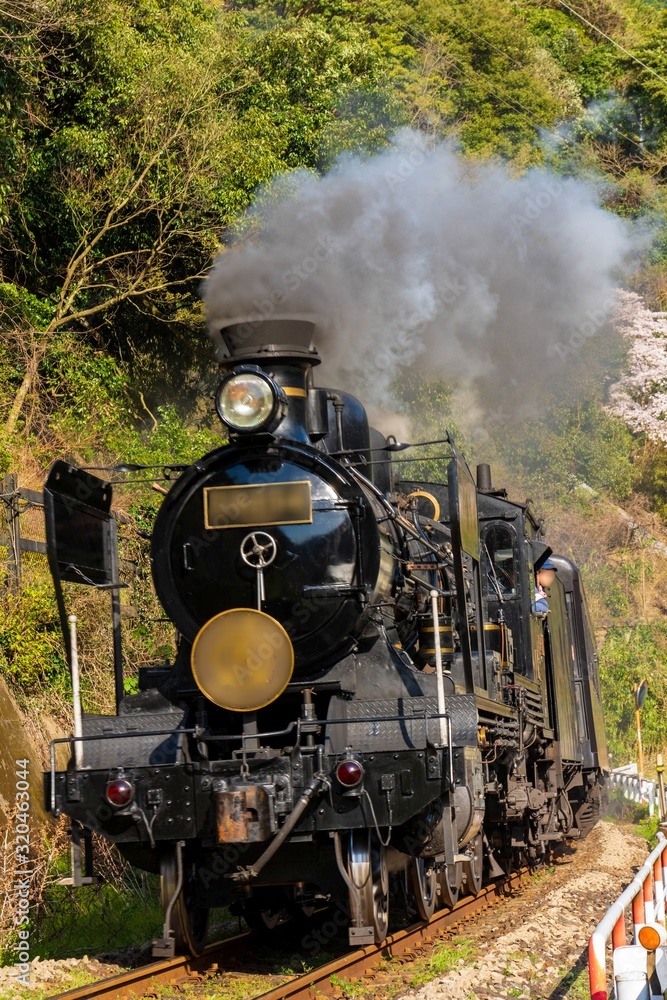 春の季節に綺麗に桜満開とSL機関車が走ります The cherry blossoms are in full bloom and the SL locomotive runs beautifully in the spring season