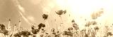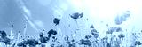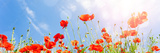 Red poppy flowers on sunny blue sky, poppies spring blossom, green meadow with flowers