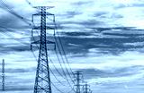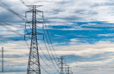 High voltage electric pylon and electrical wire with blue sky and white clouds. Tall electricity pole. Power and energy concept. High voltage grid tower with wire cable at distribution station.