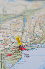 Push pin pointing at New York, United States on a map