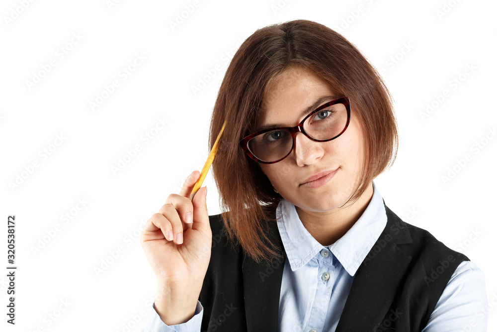 Young Woman In Glasses Thinking Pencil Head. White Background.