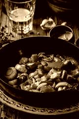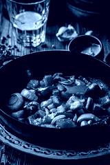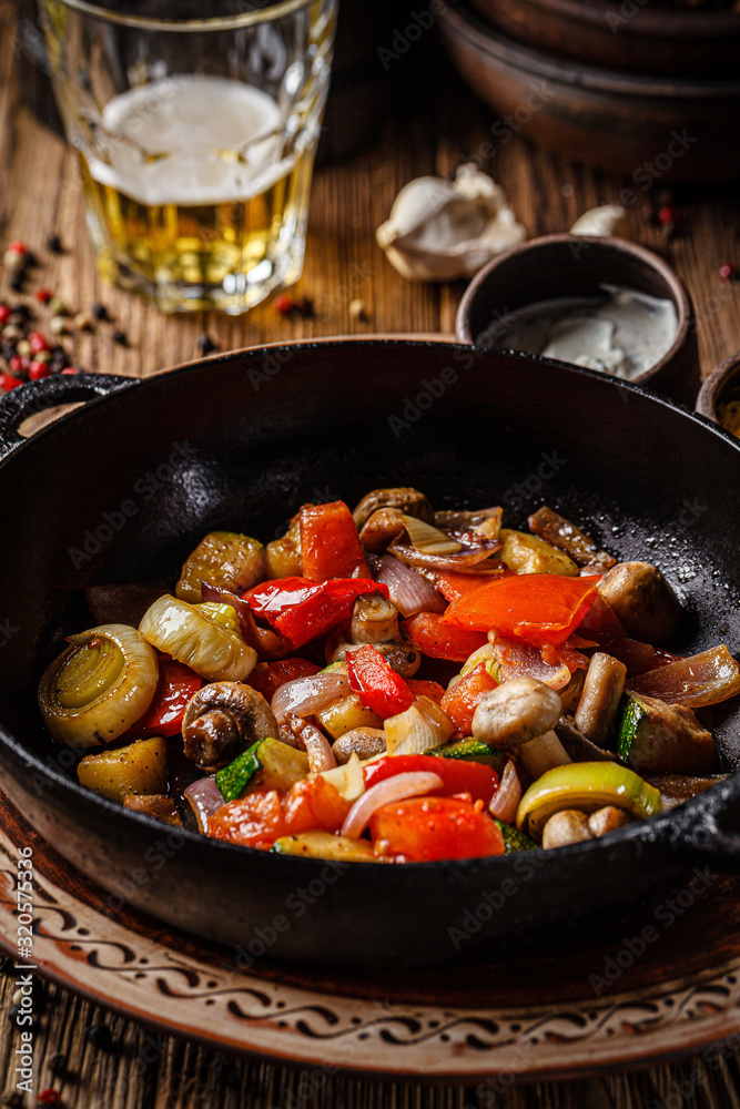 European cuisine in Ukrainian style. Warm grilled vegetable salad with beer in smoke. Serving meals in a rustic restaurant. background image, copy space text