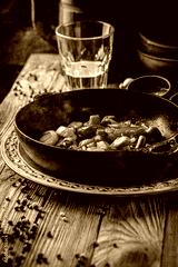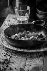 European cuisine in Ukrainian style. Warm grilled vegetable salad with beer in smoke. Serving meals in a rustic restaurant. background image, copy space text