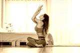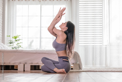 Attractive Asian woman practice yoga Eagle arms pose pose to meditation in bedroom after wake up in the morning Feeling so comfortable and relax,Healthcare Concept