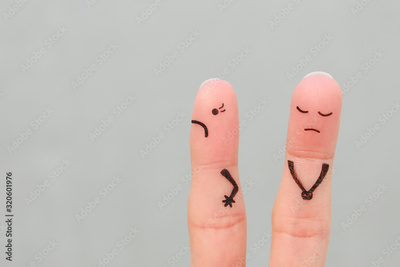 Fingers art of displeased couple. Woman was offended, man was guilty.