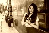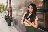 Beautiful smiling woman drink coffee walking on the city in summer day.