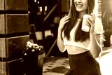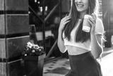 Beautiful smiling woman drink coffee walking on the city in summer day.