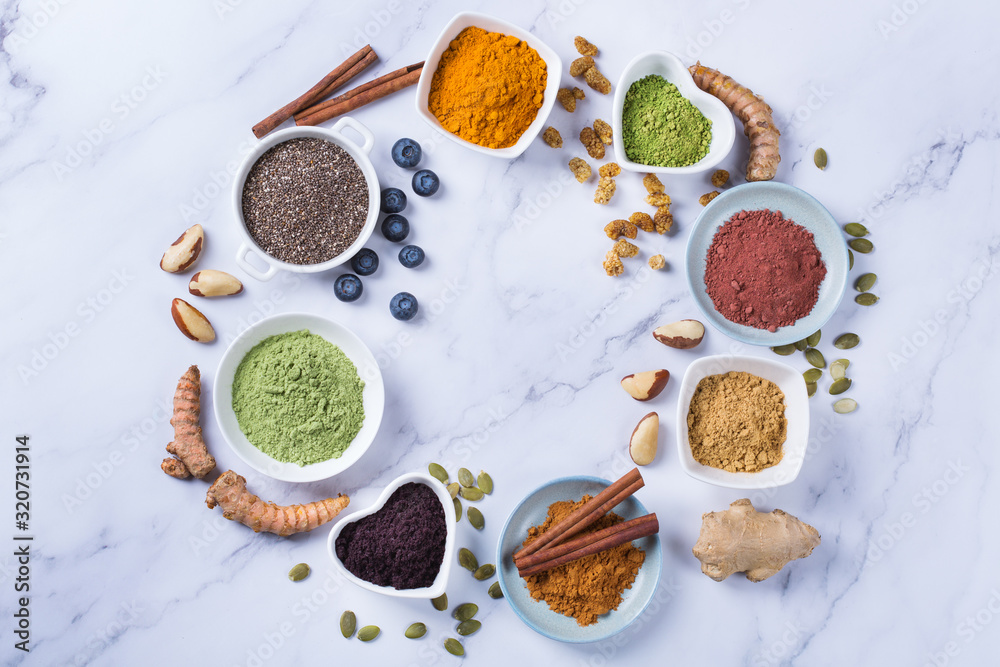 Assortment of superfood powder, acai, turmeric, ginger, matcha, cinnamon, wheat