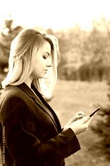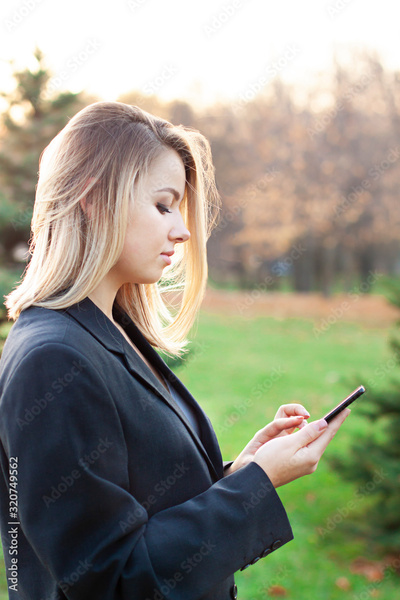 Young attractive European woman is holding a smartphone in the hands. Businesswoman is using social media in her work