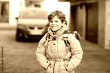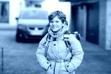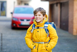 Little school kid boy of elementary class walking to school. Portrait of happy child on the street with traffic. Student with in yellow jacket and backpack in colorful winter clothes.
